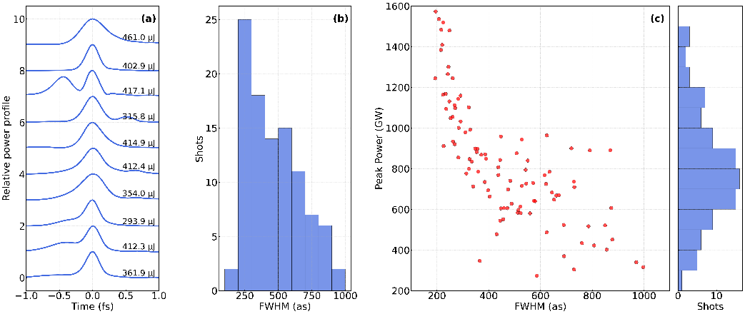 在考虑超导模组射频相位抖动等实际运行条件的情况下,数值模拟结果表明,SHINE在硬X射线波段(6 keV)可产生平均脉宽约300阿秒、峰值功率约0.8 太瓦的X射线脉冲(图2)。在1 keV软X射线波段,可实现平均脉宽约470阿秒、峰值功率同样达到太瓦量级的输出(图3)。